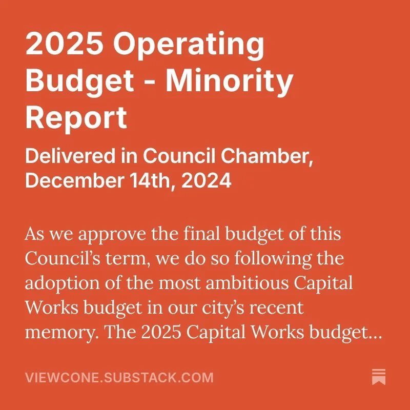 A sampling of Councillor Reports delivered a public Council meetings and Councillor columns as published in the local Westmount Independent. These links will take you a Substack, a online blogging platform. There, Conrad hosts The View Cone : Sightlines across a city. With a focus on the City of Westmount, a demerged city within the Agglomeration of Montréal (English only).