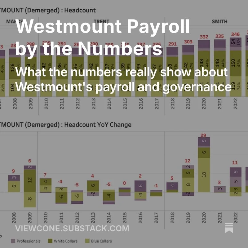 This chart shows how Westmount’s workforce has changed since 2007. It tracks the total number of employees and highlights when staffing levels rose or fell under different administrations.